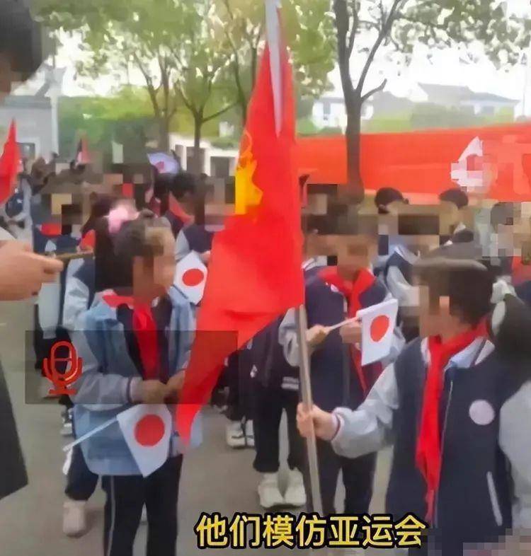 江蘇某小學的操場上,發生了一幕令人驚訝的場景:眾多身穿校服,手舉鮮艷紅領巾的小學生,每人手里竟然都高舉一個日本國旗,看起來個個興致高昂。