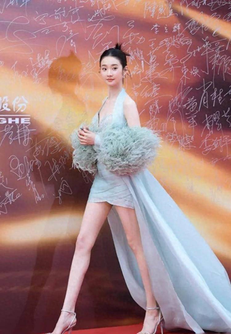 今年華表紅毯上,她一襲湖綠色掛脖長裙亮相,裙子后背連著大大的拖尾,前片只到大腿根,手臂上一圈華麗的毛絨。
